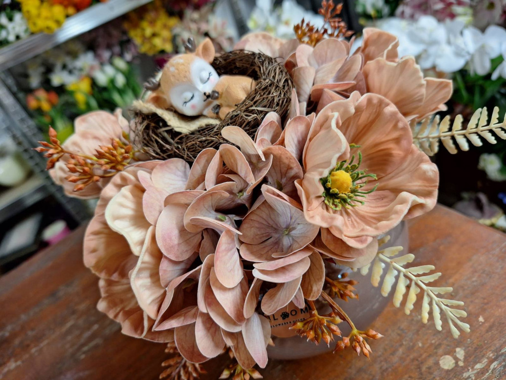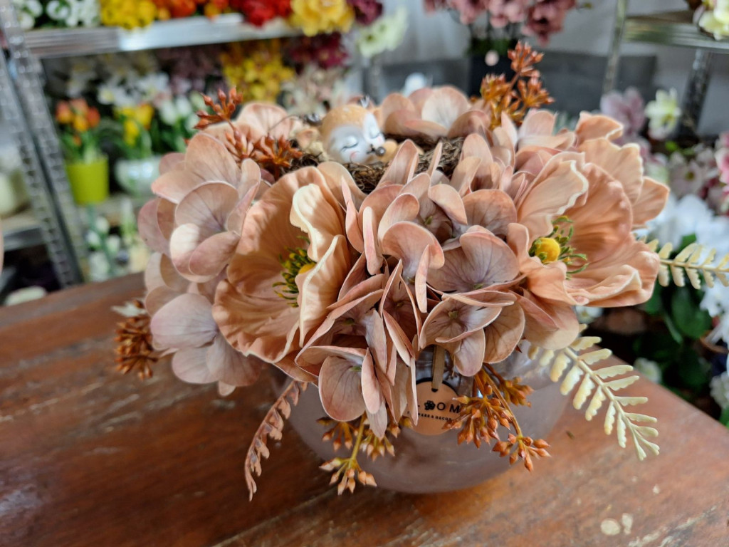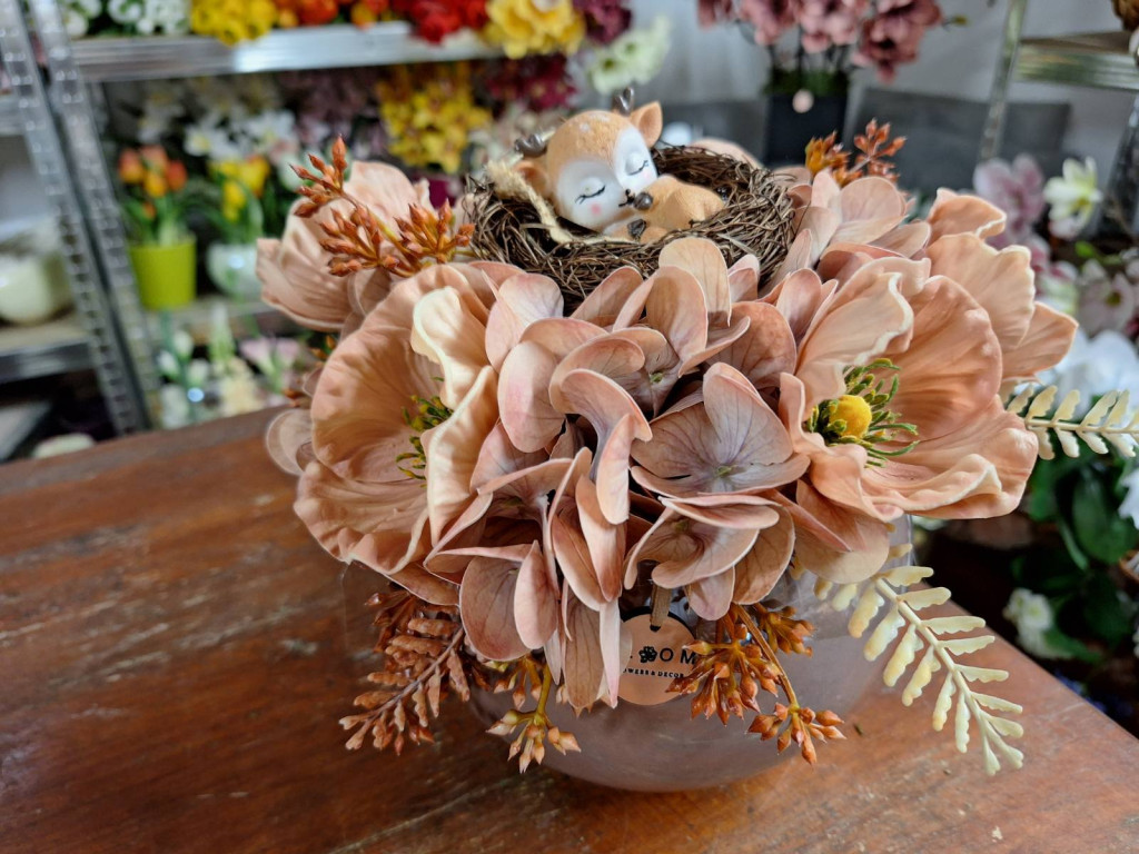 Barna magasfényű gömb kaspóban hortenzia, díszpipacs és őzike dekorációja.
