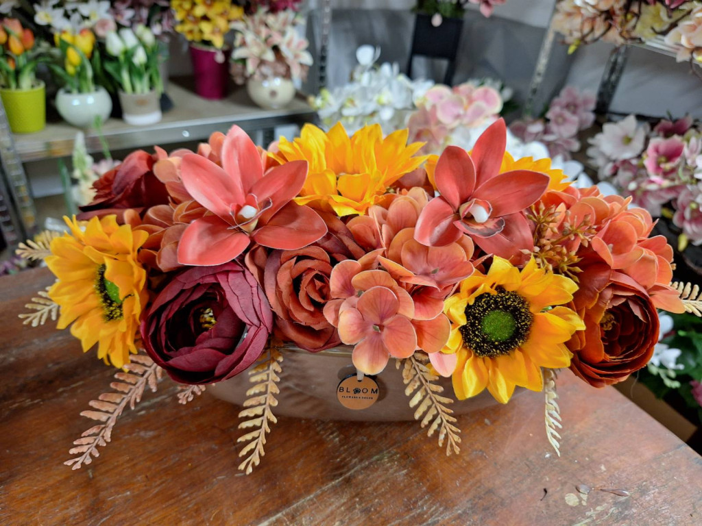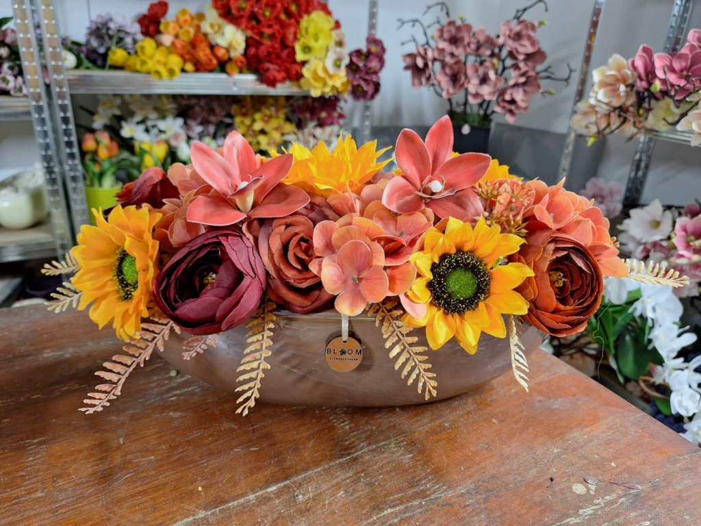 Barna magasfényű nagy méretű csónakkaspóban 40 cm, hortenzia, orchidea, boglárka és napraforgó kompozíciója.