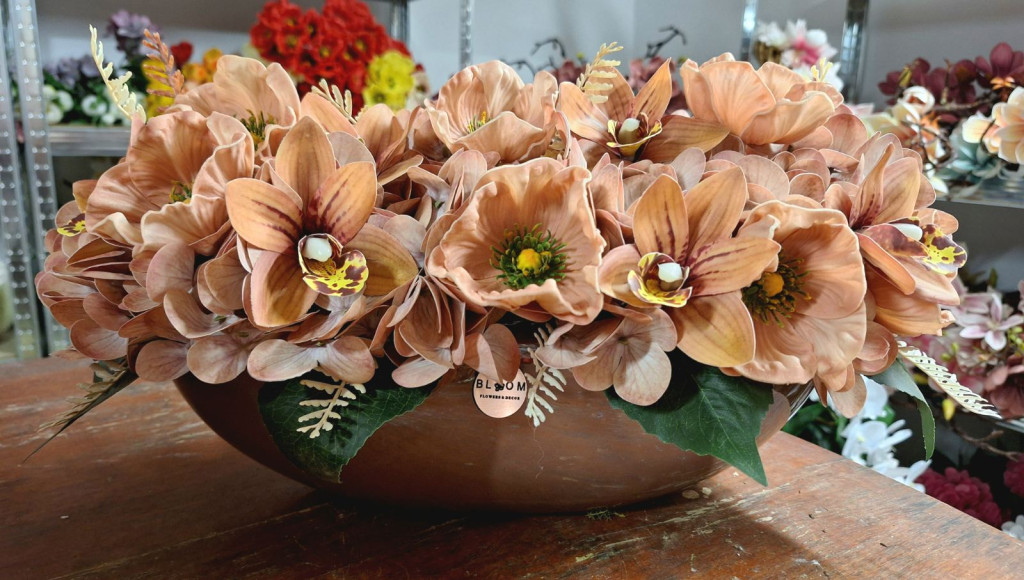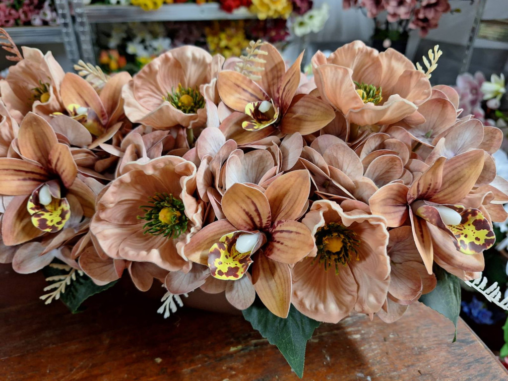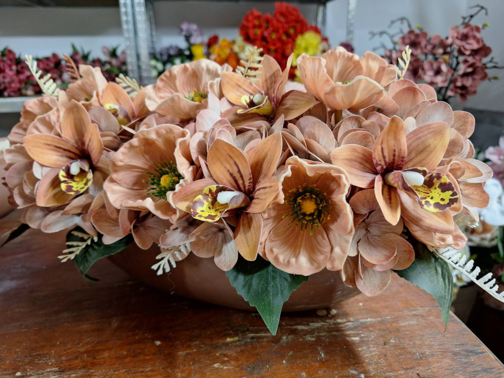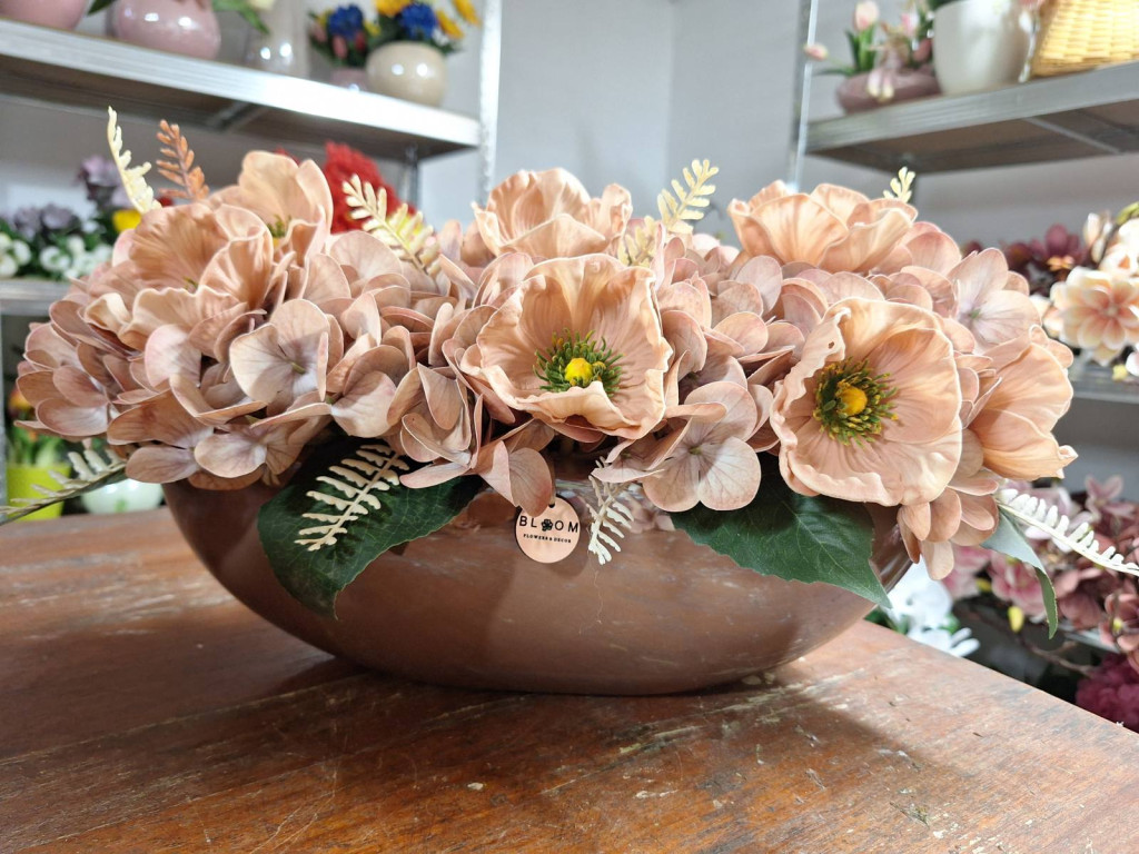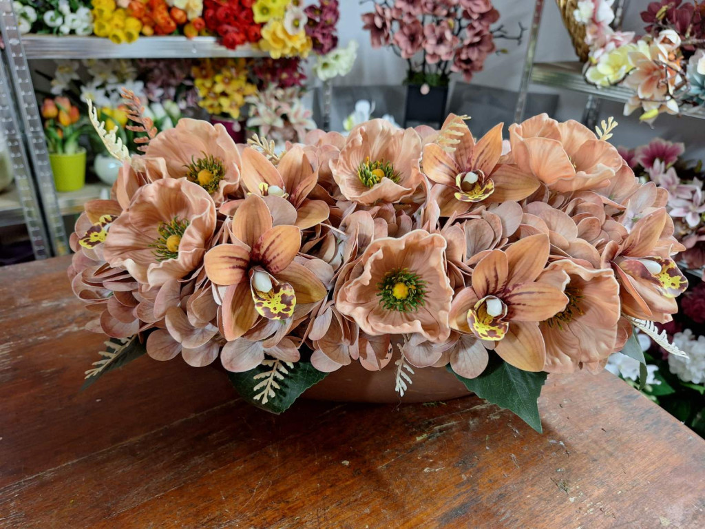 Barna magasfényű kaspó hortenziával, orchideával és díszpipaccsal díszítve