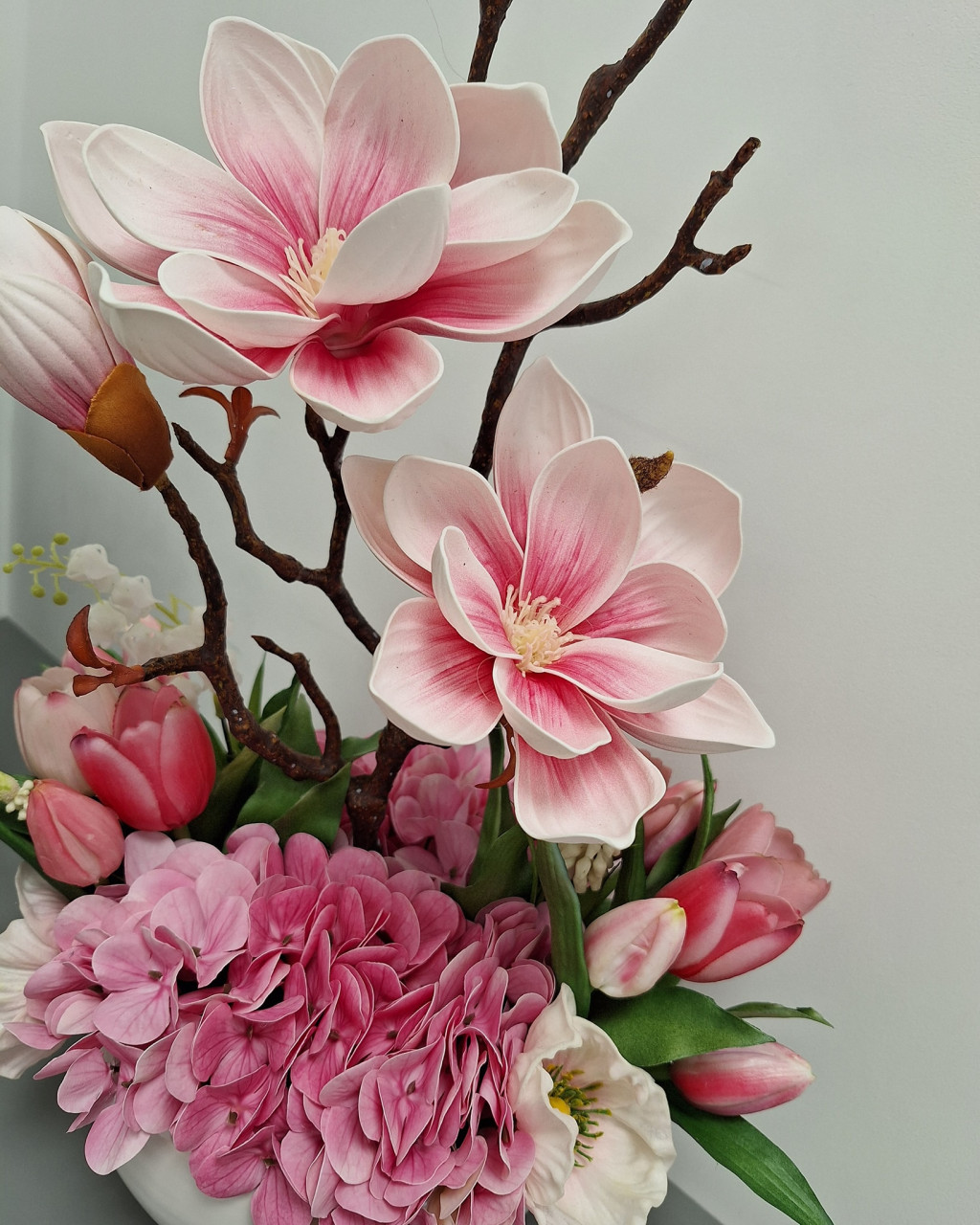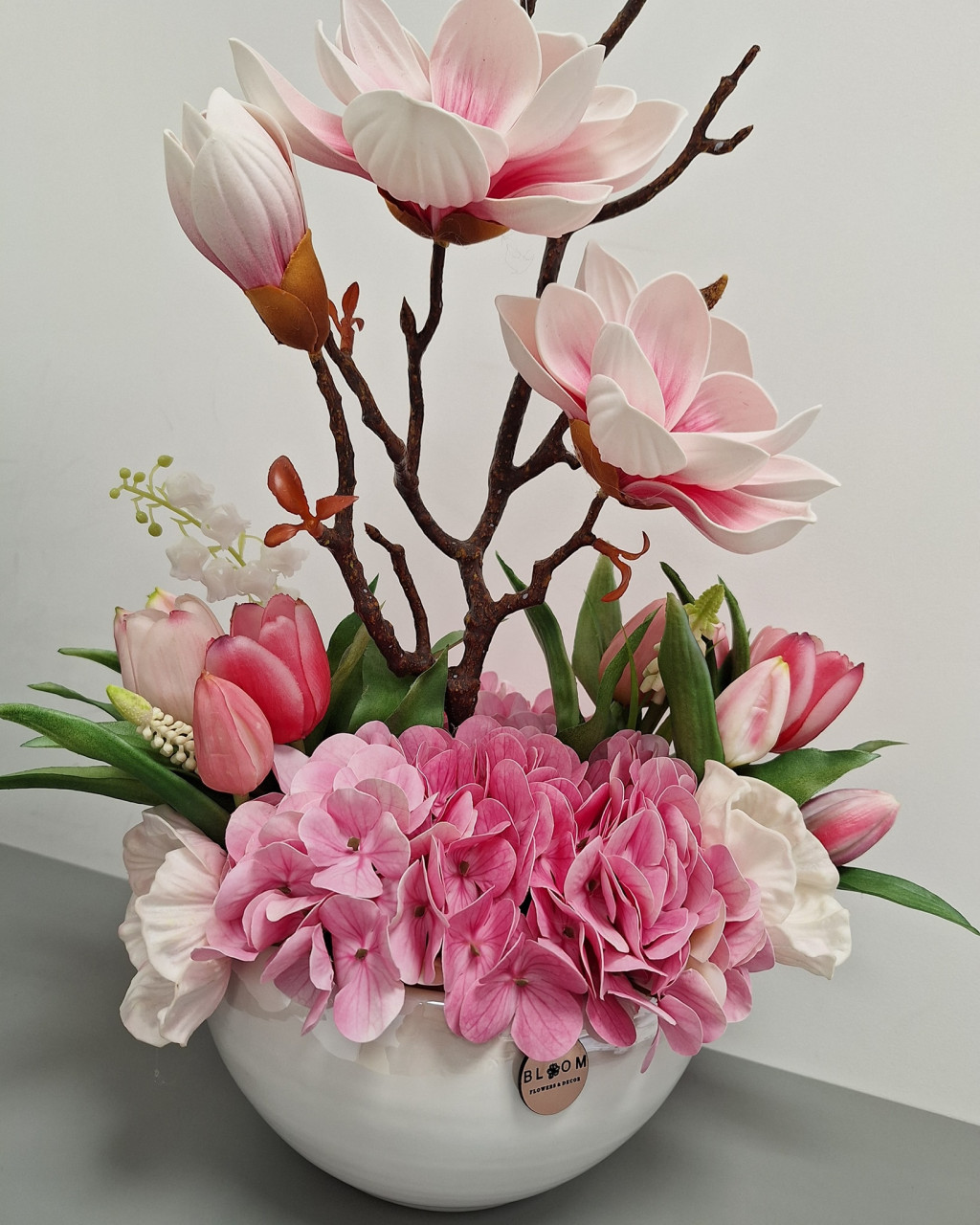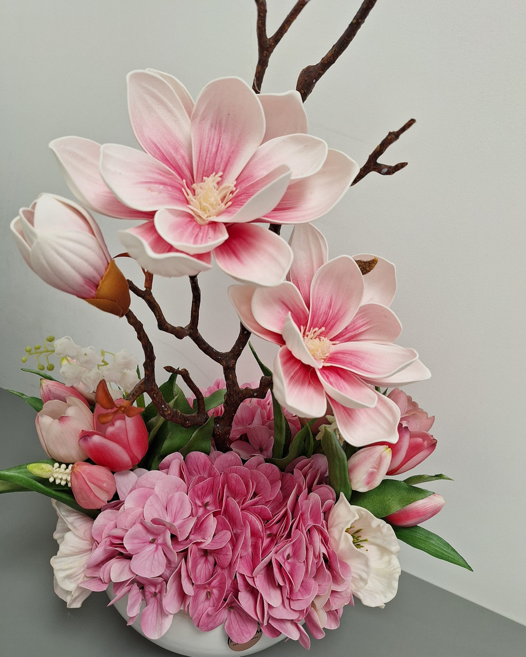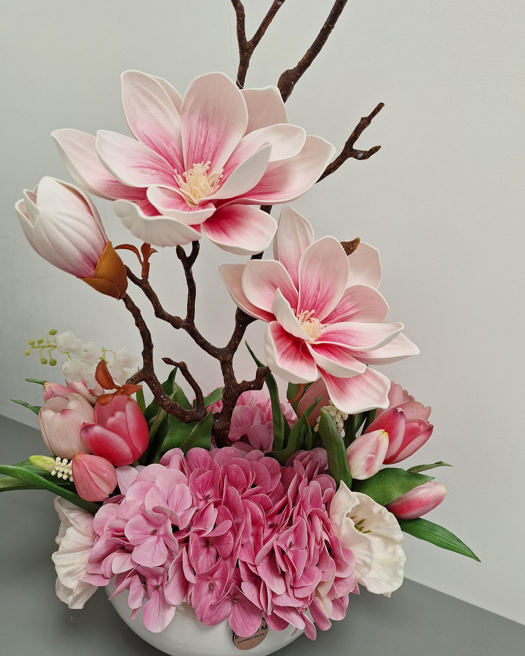 Fehér magasfényű kerámia kaspóban fehér-pink magnólia tulipánnnal, hortenziával és díszpipaccsal díszítve.