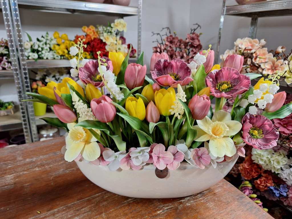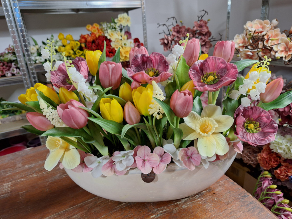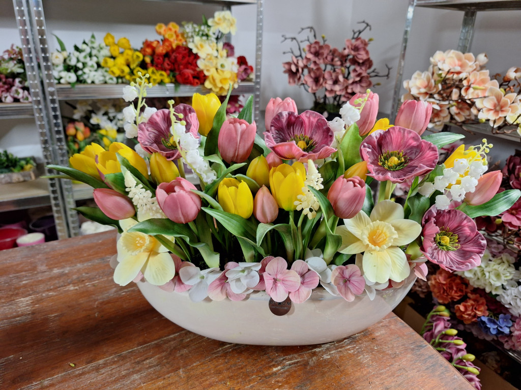Fehér tavaszváró fehér csónakkaspóban, tulipánokkal, nárciszokkal, gyönyvirággal, díszpipaccsal