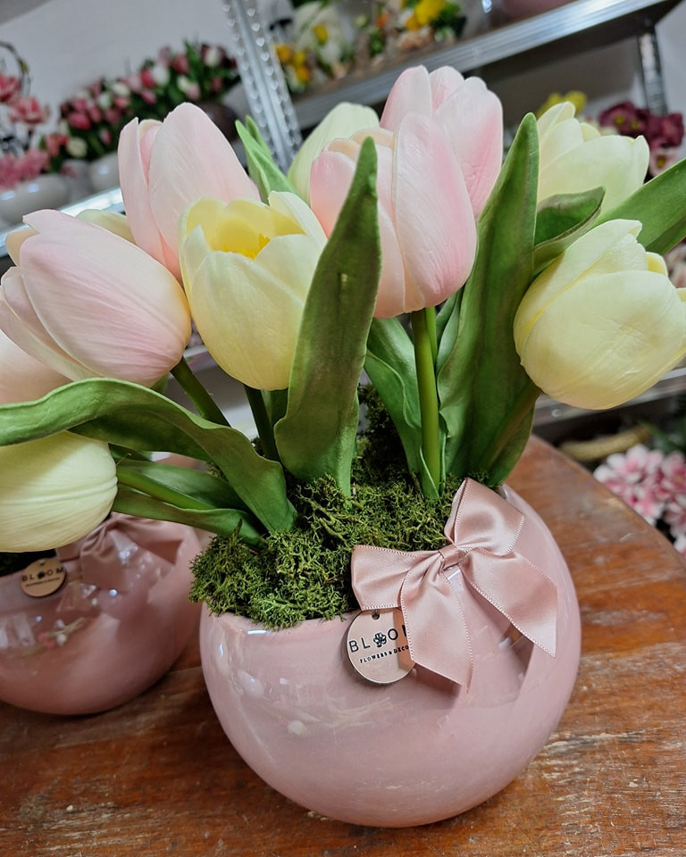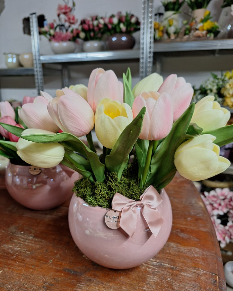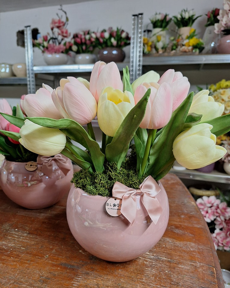 Pink magasfényű gömb kaspóban 12 szál habtulipán.