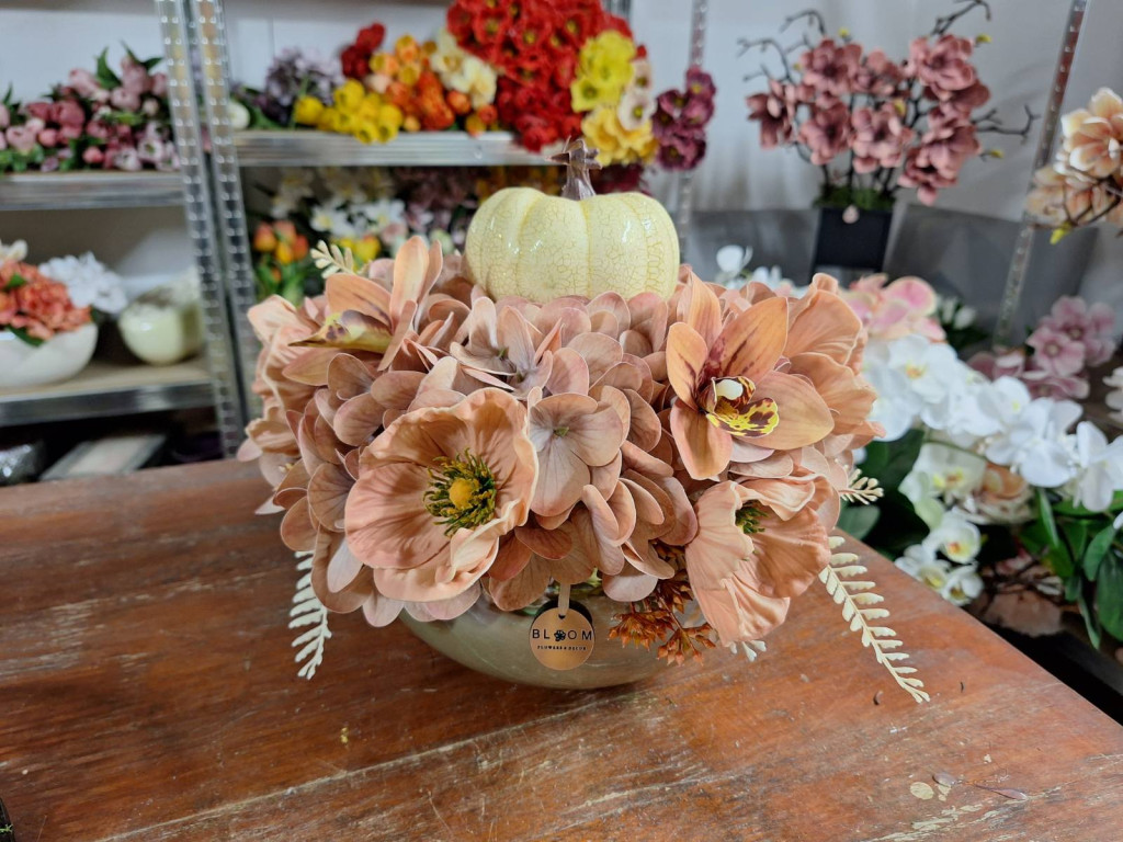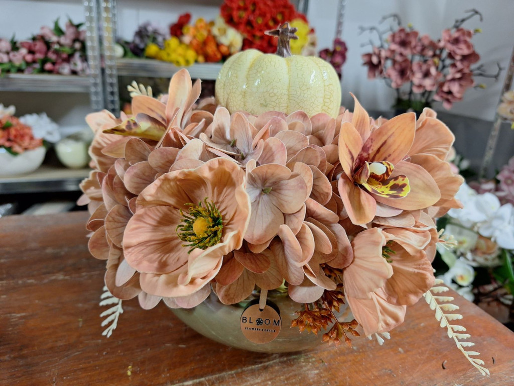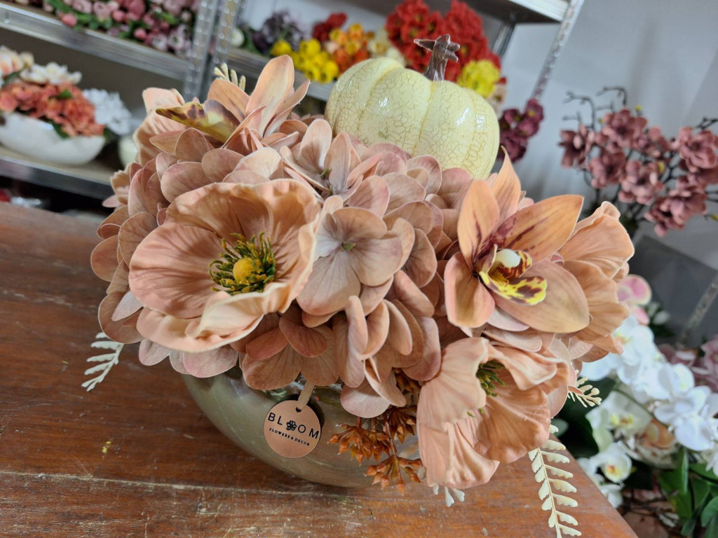 Olívazöld kaspóban hortenzia, díszpipacs és orchidea dekorációja