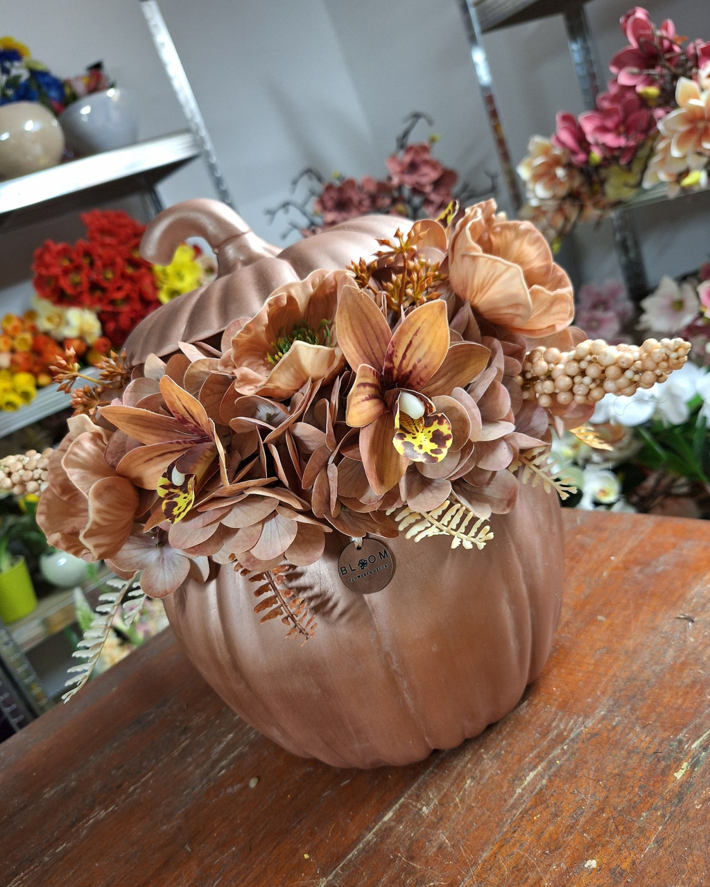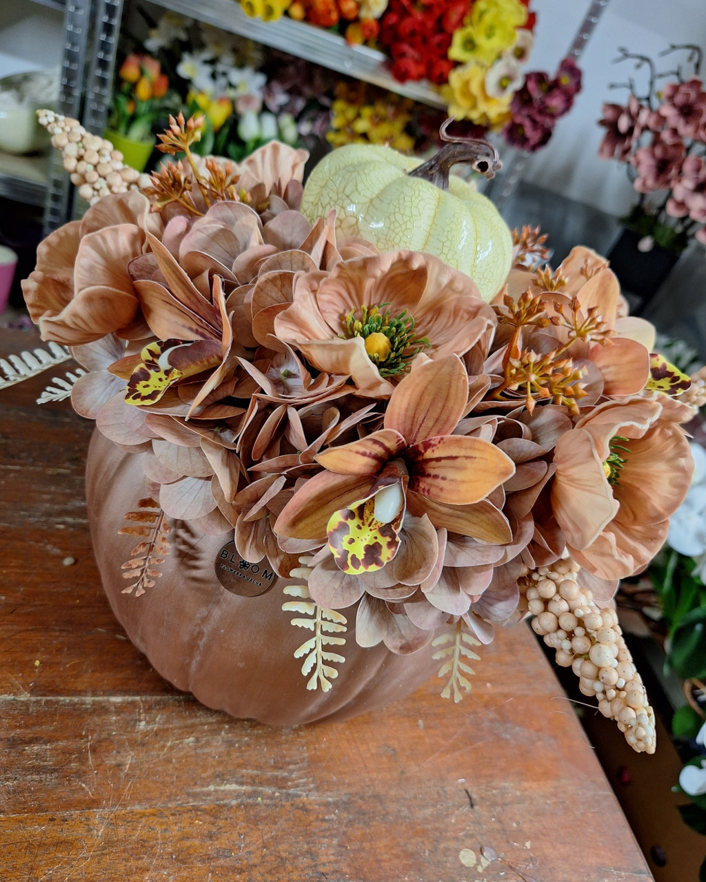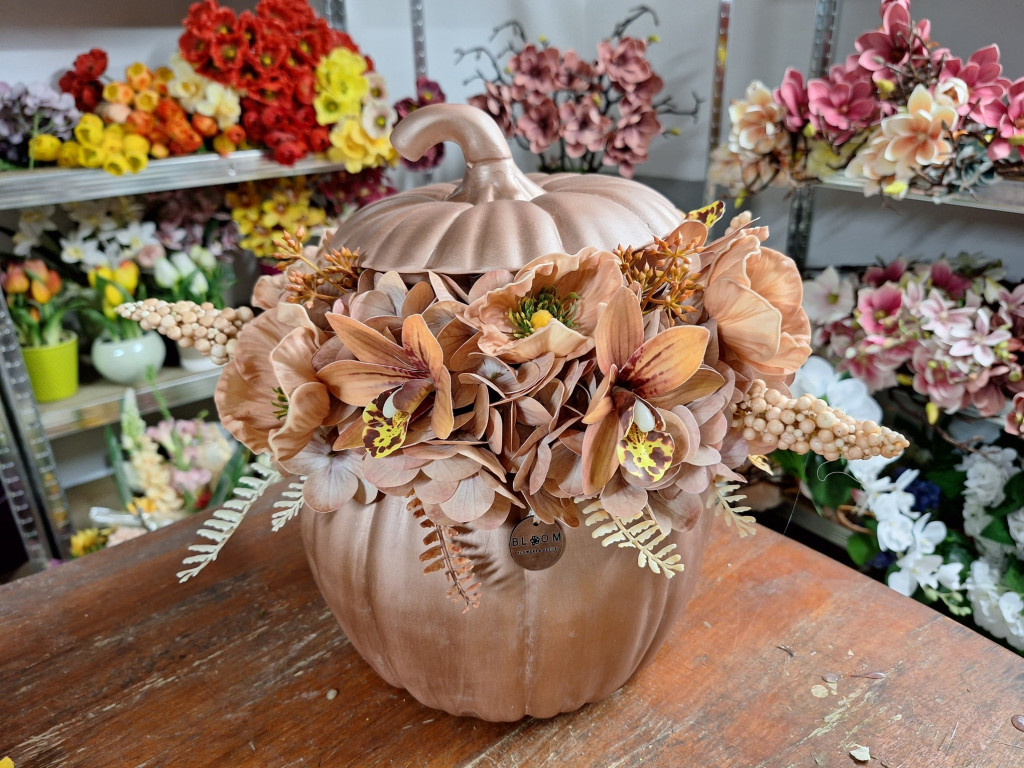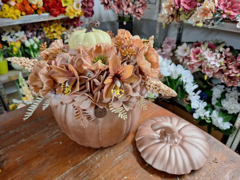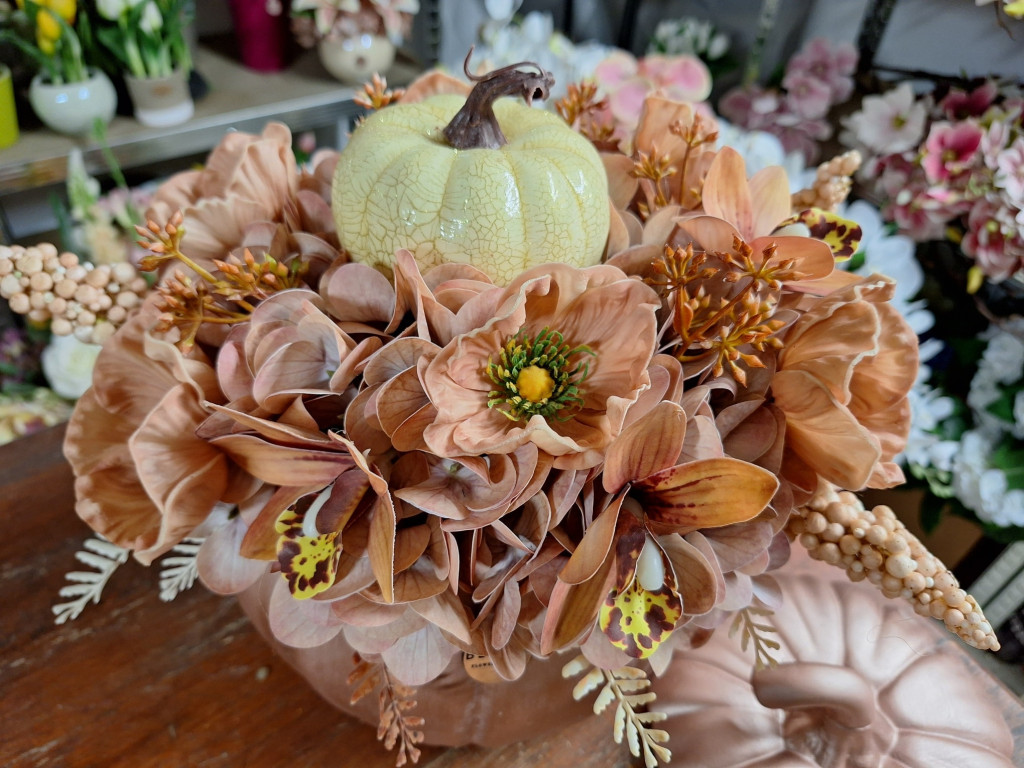 Rosegold nagy méretű kerámia tök hortenziával, díszpipaccsal, orchideával, levelekkel díszítve, középen pedig antikolt tökkel díszítve.